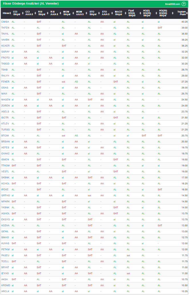 Bu çalışmada “AL” sinyali veren hisselerin tespiti amacıyla Borsa’da işlem gören BIST 100 hisseler değerlendirmeye alınmıştır. BIST 100 üzerinde teknik analizde kullanılan 12 gösterge yöntemi ile değerleme yapılarak puanlamaya gidilerek hisseler sıralanmıştır. Ancak hisse seçiminde teknik göstergelerin tek başına kullanılması yeterli değildir. Burada ön plana çıkan hisselerin temel analizle desteklemesi ve hisseyle ilgili son haber ve bilgilerin de değerlendirilerek işlemde bulunması, daha sağlıklı sonuçlar için yararlı olacaktır.