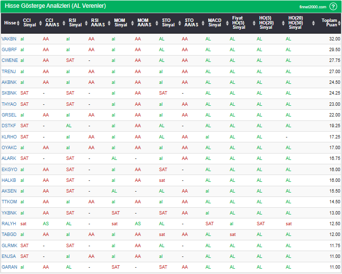 Bu çalışmada “AL” sinyali veren hisselerin tespiti amacıyla Borsa’da işlem gören BIST 100 hisseler değerlendirmeye alınmıştır. BIST 100 üzerinde teknik analizde kullanılan 12 gösterge yöntemi ile değerleme yapılarak puanlamaya gidilerek hisseler sıralanmıştır. Ancak hisse seçiminde teknik göstergelerin tek başına kullanılması yeterli değildir. Burada ön plana çıkan hisselerin temel analizle desteklemesi ve hisseyle ilgili son haber ve bilgilerin de değerlendirilerek işlemde bulunması, daha sağlıklı sonuçlar için yararlı olacaktır.