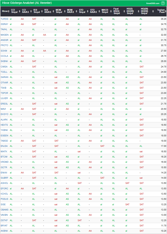 Bu çalışmada “AL” sinyali veren hisselerin tespiti amacıyla Borsa’da işlem gören BIST 100 hisseler değerlendirmeye alınmıştır. BIST 100 üzerinde teknik analizde kullanılan 12 gösterge yöntemi ile değerleme yapılarak puanlamaya gidilerek hisseler sıralanmıştır. Ancak hisse seçiminde teknik göstergelerin tek başına kullanılması yeterli değildir. Burada ön plana çıkan hisselerin temel analizle desteklemesi ve hisseyle ilgili son haber ve bilgilerin de değerlendirilerek işlemde bulunması, daha sağlıklı sonuçlar için yararlı olacaktır.
