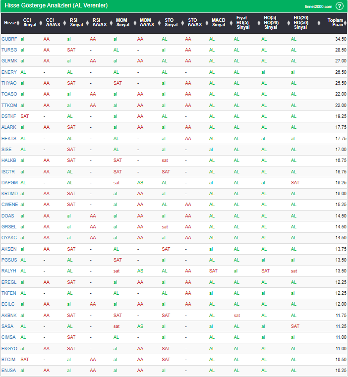 Bu çalışmada “AL” sinyali veren hisselerin tespiti amacıyla Borsa’da işlem gören BIST 100 hisseler değerlendirmeye alınmıştır. BIST 100 üzerinde teknik analizde kullanılan 12 gösterge yöntemi ile değerleme yapılarak puanlamaya gidilerek hisseler sıralanmıştır. Ancak hisse seçiminde teknik göstergelerin tek başına kullanılması yeterli değildir. Burada ön plana çıkan hisselerin temel analizle desteklemesi ve hisseyle ilgili son haber ve bilgilerin de değerlendirilerek işlemde bulunması, daha sağlıklı sonuçlar için yararlı olacaktır.