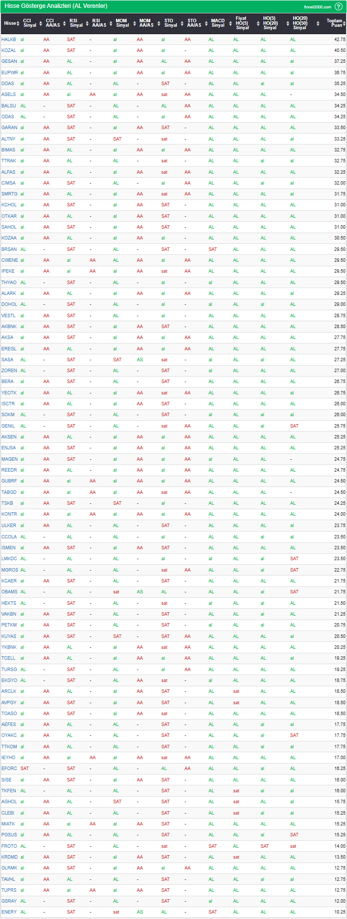 Bu çalışmada “AL” sinyali veren hisselerin tespiti amacıyla Borsa’da işlem gören BIST 100 hisseler değerlendirmeye alınmıştır. BIST 100 üzerinde teknik analizde kullanılan 12 gösterge yöntemi ile değerleme yapılarak puanlamaya gidilerek hisseler sıralanmıştır. Ancak hisse seçiminde teknik göstergelerin tek başına kullanılması yeterli değildir. Burada ön plana çıkan hisselerin temel analizle desteklemesi ve hisseyle ilgili son haber ve bilgilerin de değerlendirilerek işlemde bulunması, daha sağlıklı sonuçlar için yararlı olacaktır.
