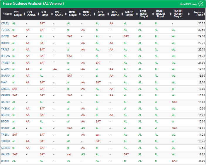 Bu çalışmada “AL” sinyali veren hisselerin tespiti amacıyla Borsa’da işlem gören BIST 100 hisseler değerlendirmeye alınmıştır. BIST 100 üzerinde teknik analizde kullanılan 12 gösterge yöntemi ile değerleme yapılarak puanlamaya gidilerek hisseler sıralanmıştır. Ancak hisse seçiminde teknik göstergelerin tek başına kullanılması yeterli değildir. Burada ön plana çıkan hisselerin temel analizle desteklemesi ve hisseyle ilgili son haber ve bilgilerin de değerlendirilerek işlemde bulunması, daha sağlıklı sonuçlar için yararlı olacaktır.