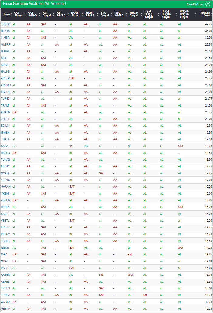 Bu çalışmada “AL” sinyali veren hisselerin tespiti amacıyla Borsa’da işlem gören BIST 100 hisseler değerlendirmeye alınmıştır. BIST 100 üzerinde teknik analizde kullanılan 12 gösterge yöntemi ile değerleme yapılarak puanlamaya gidilerek hisseler sıralanmıştır. Ancak hisse seçiminde teknik göstergelerin tek başına kullanılması yeterli değildir. Burada ön plana çıkan hisselerin temel analizle desteklemesi ve hisseyle ilgili son haber ve bilgilerin de değerlendirilerek işlemde bulunması, daha sağlıklı sonuçlar için yararlı olacaktır.
