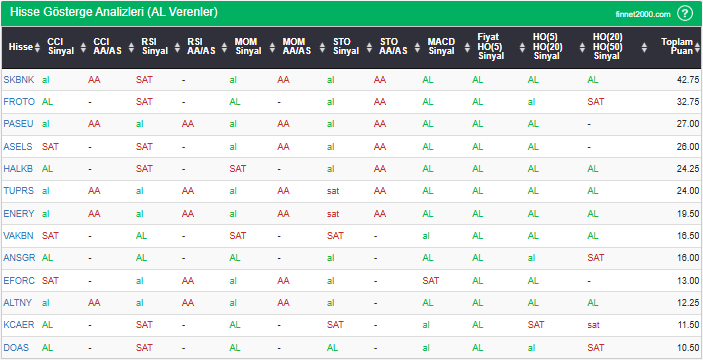 Bu çalışmada “AL” sinyali veren hisselerin tespiti amacıyla Borsa’da işlem gören BIST 100 hisseler değerlendirmeye alınmıştır. BIST 100 üzerinde teknik analizde kullanılan 12 gösterge yöntemi ile değerleme yapılarak puanlamaya gidilerek hisseler sıralanmıştır. Ancak hisse seçiminde teknik göstergelerin tek başına kullanılması yeterli değildir. Burada ön plana çıkan hisselerin temel analizle desteklemesi ve hisseyle ilgili son haber ve bilgilerin de değerlendirilerek işlemde bulunması, daha sağlıklı sonuçlar için yararlı olacaktır.