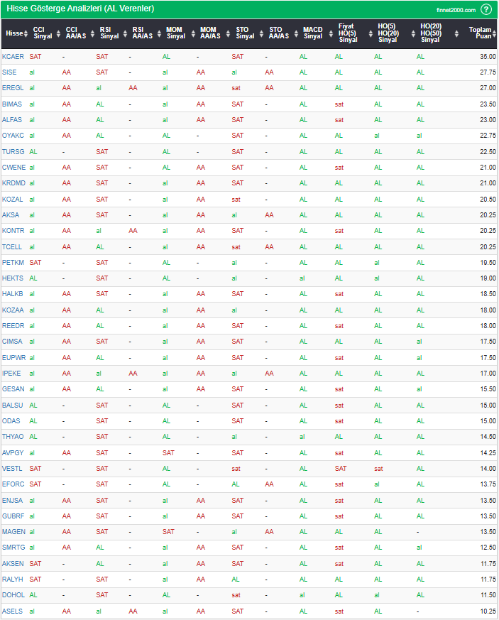 Bu çalışmada “AL” sinyali veren hisselerin tespiti amacıyla Borsa’da işlem gören BIST 100 hisseler değerlendirmeye alınmıştır. BIST 100 üzerinde teknik analizde kullanılan 12 gösterge yöntemi ile değerleme yapılarak puanlamaya gidilerek hisseler sıralanmıştır. Ancak hisse seçiminde teknik göstergelerin tek başına kullanılması yeterli değildir. Burada ön plana çıkan hisselerin temel analizle desteklemesi ve hisseyle ilgili son haber ve bilgilerin de değerlendirilerek işlemde bulunması, daha sağlıklı sonuçlar için yararlı olacaktır.