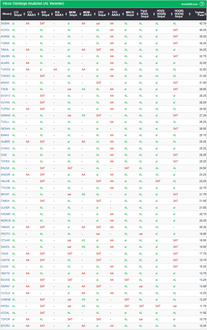 Bu çalışmada “AL” sinyali veren hisselerin tespiti amacıyla Borsa’da işlem gören BIST 100 hisseler değerlendirmeye alınmıştır. BIST 100 üzerinde teknik analizde kullanılan 12 gösterge yöntemi ile değerleme yapılarak puanlamaya gidilerek hisseler sıralanmıştır. Ancak hisse seçiminde teknik göstergelerin tek başına kullanılması yeterli değildir. Burada ön plana çıkan hisselerin temel analizle desteklemesi ve hisseyle ilgili son haber ve bilgilerin de değerlendirilerek işlemde bulunması, daha sağlıklı sonuçlar için yararlı olacaktır.