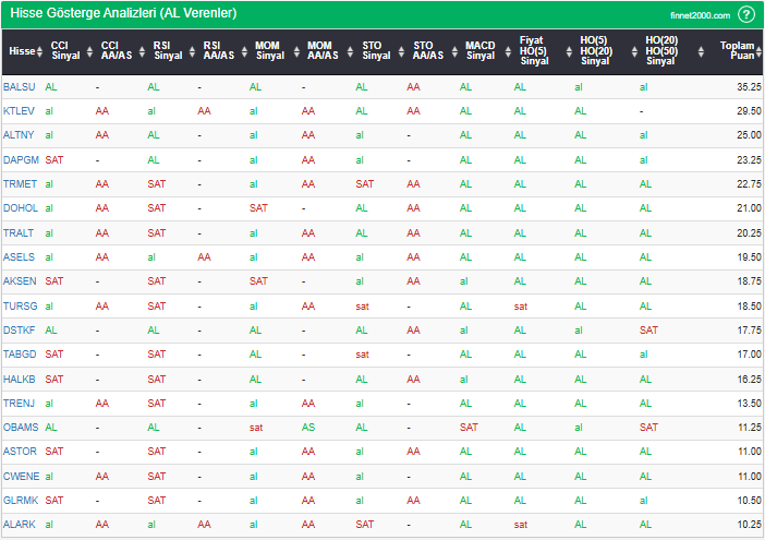 Bu çalışmada “AL” sinyali veren hisselerin tespiti amacıyla Borsa’da işlem gören BIST 100 hisseler değerlendirmeye alınmıştır. BIST 100 üzerinde teknik analizde kullanılan 12 gösterge yöntemi ile değerleme yapılarak puanlamaya gidilerek hisseler sıralanmıştır. Ancak hisse seçiminde teknik göstergelerin tek başına kullanılması yeterli değildir. Burada ön plana çıkan hisselerin temel analizle desteklemesi ve hisseyle ilgili son haber ve bilgilerin de değerlendirilerek işlemde bulunması, daha sağlıklı sonuçlar için yararlı olacaktır.