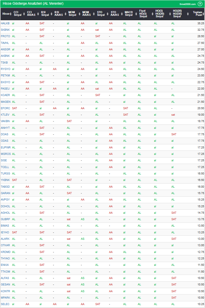 Bu çalışmada “AL” sinyali veren hisselerin tespiti amacıyla Borsa’da işlem gören BIST 100 hisseler değerlendirmeye alınmıştır. BIST 100 üzerinde teknik analizde kullanılan 12 gösterge yöntemi ile değerleme yapılarak puanlamaya gidilerek hisseler sıralanmıştır. Ancak hisse seçiminde teknik göstergelerin tek başına kullanılması yeterli değildir. Burada ön plana çıkan hisselerin temel analizle desteklemesi ve hisseyle ilgili son haber ve bilgilerin de değerlendirilerek işlemde bulunması, daha sağlıklı sonuçlar için yararlı olacaktır.