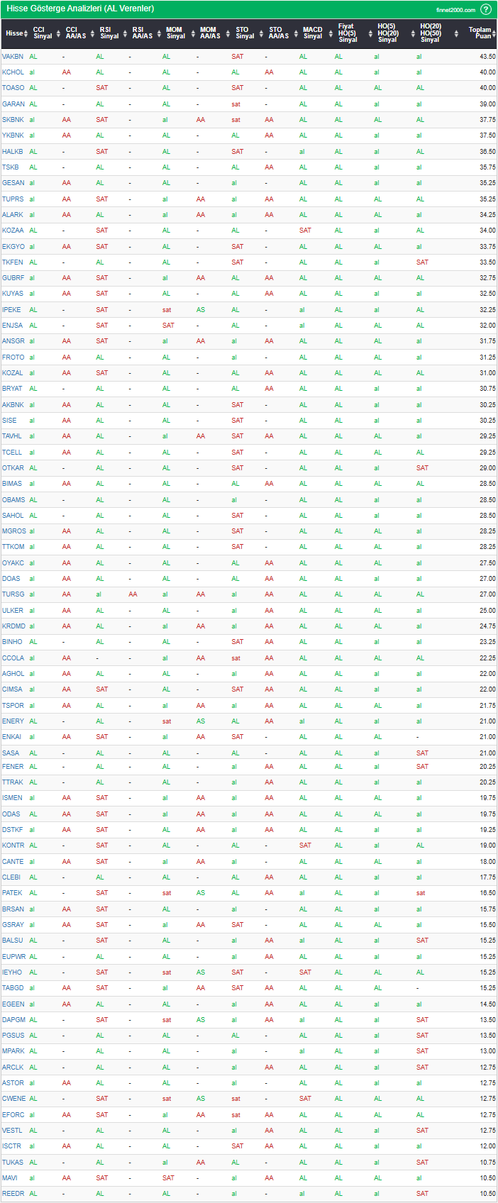 Bu çalışmada “AL” sinyali veren hisselerin tespiti amacıyla Borsa’da işlem gören BIST 100 hisseler değerlendirmeye alınmıştır. BIST 100 üzerinde teknik analizde kullanılan 12 gösterge yöntemi ile değerleme yapılarak puanlamaya gidilerek hisseler sıralanmıştır. Ancak hisse seçiminde teknik göstergelerin tek başına kullanılması yeterli değildir. Burada ön plana çıkan hisselerin temel analizle desteklemesi ve hisseyle ilgili son haber ve bilgilerin de değerlendirilerek işlemde bulunması, daha sağlıklı sonuçlar için yararlı olacaktır.