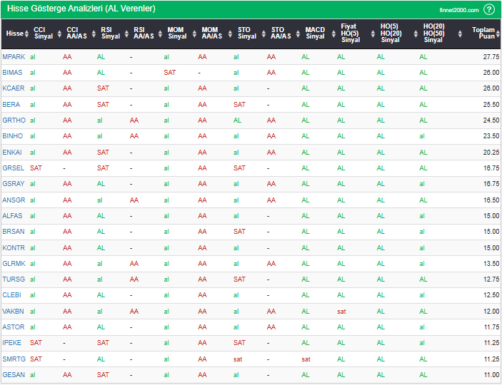 Bu çalışmada “AL” sinyali veren hisselerin tespiti amacıyla Borsa’da işlem gören BIST 100 hisseler değerlendirmeye alınmıştır. BIST 100 üzerinde teknik analizde kullanılan 12 gösterge yöntemi ile değerleme yapılarak puanlamaya gidilerek hisseler sıralanmıştır. Ancak hisse seçiminde teknik göstergelerin tek başına kullanılması yeterli değildir. Burada ön plana çıkan hisselerin temel analizle desteklemesi ve hisseyle ilgili son haber ve bilgilerin de değerlendirilerek işlemde bulunması, daha sağlıklı sonuçlar için yararlı olacaktır.