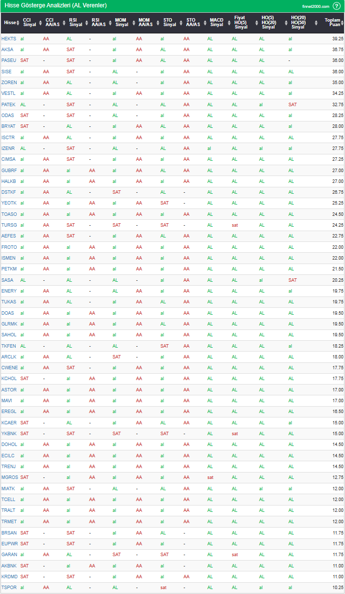 Bu çalışmada “AL” sinyali veren hisselerin tespiti amacıyla Borsa’da işlem gören BIST 100 hisseler değerlendirmeye alınmıştır. BIST 100 üzerinde teknik analizde kullanılan 12 gösterge yöntemi ile değerleme yapılarak puanlamaya gidilerek hisseler sıralanmıştır. Ancak hisse seçiminde teknik göstergelerin tek başına kullanılması yeterli değildir. Burada ön plana çıkan hisselerin temel analizle desteklemesi ve hisseyle ilgili son haber ve bilgilerin de değerlendirilerek işlemde bulunması, daha sağlıklı sonuçlar için yararlı olacaktır.