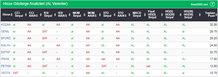 Bu çalışmada “AL” sinyali veren hisselerin tespiti amacıyla Borsa’da işlem gören BIST 100 hisseler değerlendirmeye alınmıştır. BIST 100 üzerinde teknik analizde kullanılan 12 gösterge yöntemi ile değerleme yapılarak puanlamaya gidilerek hisseler sıralanmıştır. Ancak hisse seçiminde teknik göstergelerin tek başına kullanılması yeterli değildir. Burada ön plana çıkan hisselerin temel analizle desteklemesi ve hisseyle ilgili son haber ve bilgilerin de değerlendirilerek işlemde bulunması, daha sağlıklı sonuçlar için yararlı olacaktır.