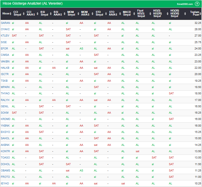 Bu çalışmada “AL” sinyali veren hisselerin tespiti amacıyla Borsa’da işlem gören BIST 100 hisseler değerlendirmeye alınmıştır. BIST 100 üzerinde teknik analizde kullanılan 12 gösterge yöntemi ile değerleme yapılarak puanlamaya gidilerek hisseler sıralanmıştır. Ancak hisse seçiminde teknik göstergelerin tek başına kullanılması yeterli değildir. Burada ön plana çıkan hisselerin temel analizle desteklemesi ve hisseyle ilgili son haber ve bilgilerin de değerlendirilerek işlemde bulunması, daha sağlıklı sonuçlar için yararlı olacaktır.