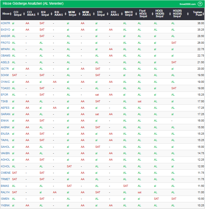 Bu çalışmada “AL” sinyali veren hisselerin tespiti amacıyla Borsa’da işlem gören BIST 100 hisseler değerlendirmeye alınmıştır. BIST 100 üzerinde teknik analizde kullanılan 12 gösterge yöntemi ile değerleme yapılarak puanlamaya gidilerek hisseler sıralanmıştır. Ancak hisse seçiminde teknik göstergelerin tek başına kullanılması yeterli değildir. Burada ön plana çıkan hisselerin temel analizle desteklemesi ve hisseyle ilgili son haber ve bilgilerin de değerlendirilerek işlemde bulunması, daha sağlıklı sonuçlar için yararlı olacaktır.