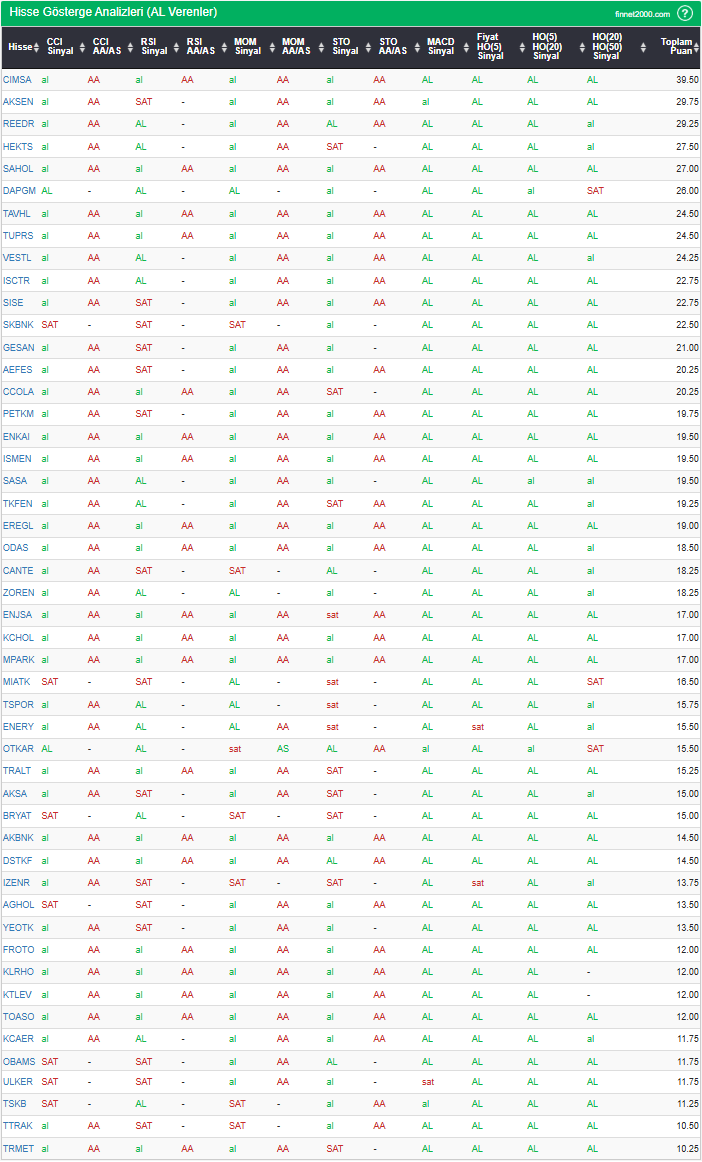 Bu çalışmada “AL” sinyali veren hisselerin tespiti amacıyla Borsa’da işlem gören BIST 100 hisseler değerlendirmeye alınmıştır. BIST 100 üzerinde teknik analizde kullanılan 12 gösterge yöntemi ile değerleme yapılarak puanlamaya gidilerek hisseler sıralanmıştır. Ancak hisse seçiminde teknik göstergelerin tek başına kullanılması yeterli değildir. Burada ön plana çıkan hisselerin temel analizle desteklemesi ve hisseyle ilgili son haber ve bilgilerin de değerlendirilerek işlemde bulunması, daha sağlıklı sonuçlar için yararlı olacaktır.