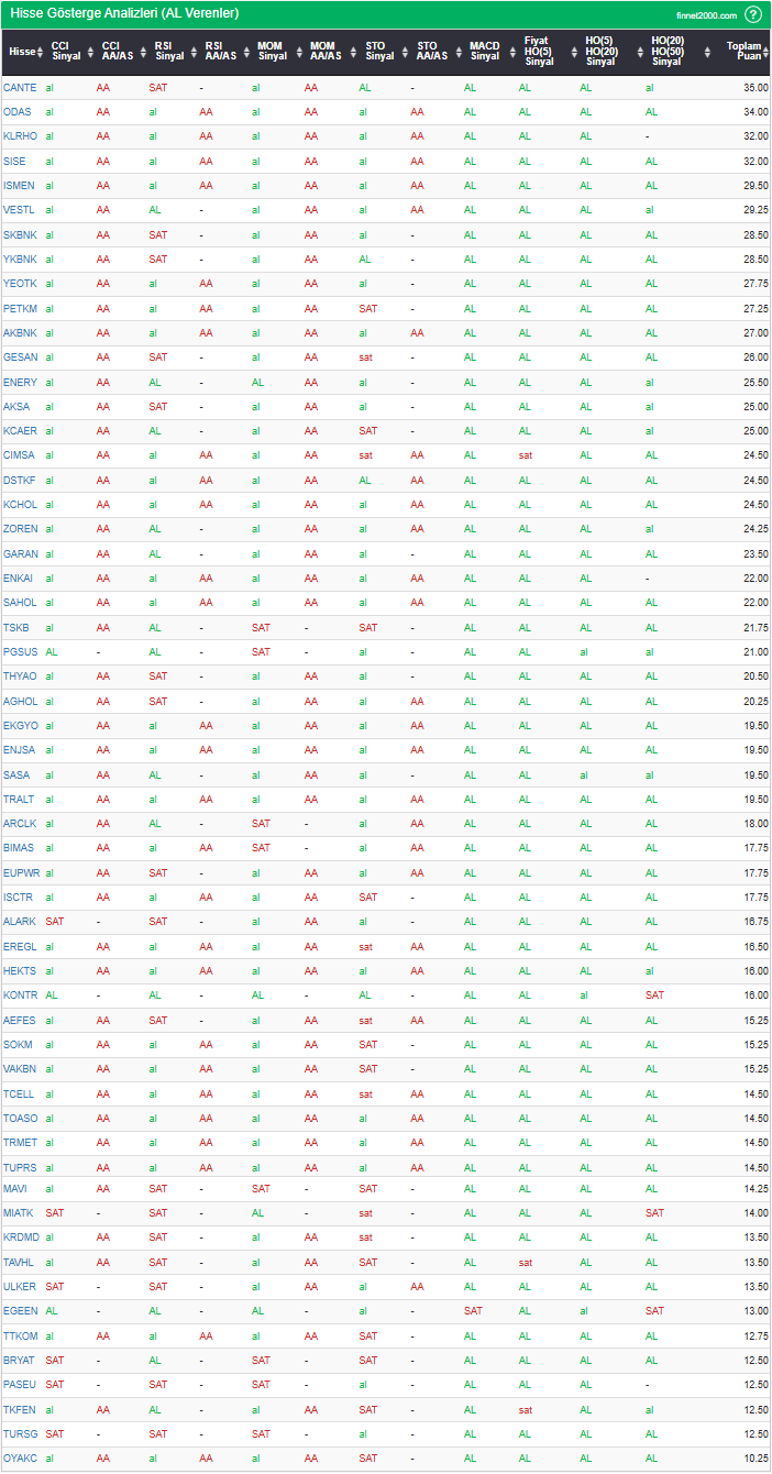 Bu çalışmada “AL” sinyali veren hisselerin tespiti amacıyla Borsa’da işlem gören BIST 100 hisseler değerlendirmeye alınmıştır. BIST 100 üzerinde teknik analizde kullanılan 12 gösterge yöntemi ile değerleme yapılarak puanlamaya gidilerek hisseler sıralanmıştır. Ancak hisse seçiminde teknik göstergelerin tek başına kullanılması yeterli değildir. Burada ön plana çıkan hisselerin temel analizle desteklemesi ve hisseyle ilgili son haber ve bilgilerin de değerlendirilerek işlemde bulunması, daha sağlıklı sonuçlar için yararlı olacaktır.