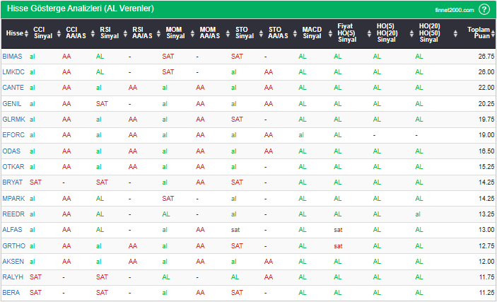 Bu çalışmada “AL” sinyali veren hisselerin tespiti amacıyla Borsa’da işlem gören BIST 100 hisseler değerlendirmeye alınmıştır. BIST 100 üzerinde teknik analizde kullanılan 12 gösterge yöntemi ile değerleme yapılarak puanlamaya gidilerek hisseler sıralanmıştır. Ancak hisse seçiminde teknik göstergelerin tek başına kullanılması yeterli değildir. Burada ön plana çıkan hisselerin temel analizle desteklemesi ve hisseyle ilgili son haber ve bilgilerin de değerlendirilerek işlemde bulunması, daha sağlıklı sonuçlar için yararlı olacaktır.