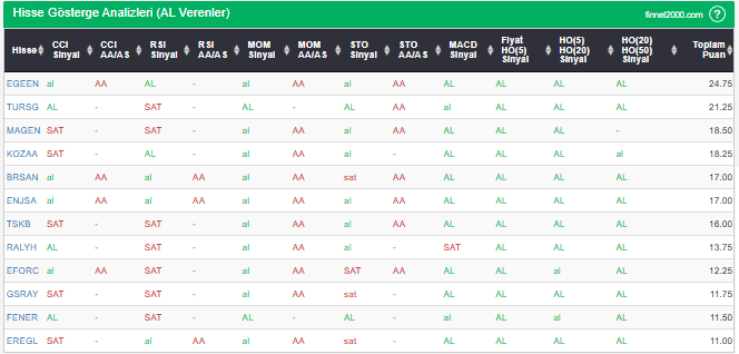 Bu çalışmada “AL” sinyali veren hisselerin tespiti amacıyla Borsa’da işlem gören BIST 100 hisseler değerlendirmeye alınmıştır. BIST 100 üzerinde teknik analizde kullanılan 12 gösterge yöntemi ile değerleme yapılarak puanlamaya gidilerek hisseler sıralanmıştır. Ancak hisse seçiminde teknik göstergelerin tek başına kullanılması yeterli değildir. Burada ön plana çıkan hisselerin temel analizle desteklemesi ve hisseyle ilgili son haber ve bilgilerin de değerlendirilerek işlemde bulunması, daha sağlıklı sonuçlar için yararlı olacaktır.