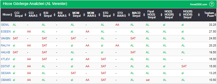 Bu çalışmada “AL” sinyali veren hisselerin tespiti amacıyla Borsa’da işlem gören BIST 100 hisseler değerlendirmeye alınmıştır. BIST 100 üzerinde teknik analizde kullanılan 12 gösterge yöntemi ile değerleme yapılarak puanlamaya gidilerek hisseler sıralanmıştır. Ancak hisse seçiminde teknik göstergelerin tek başına kullanılması yeterli değildir. Burada ön plana çıkan hisselerin temel analizle desteklemesi ve hisseyle ilgili son haber ve bilgilerin de değerlendirilerek işlemde bulunması, daha sağlıklı sonuçlar için yararlı olacaktır.