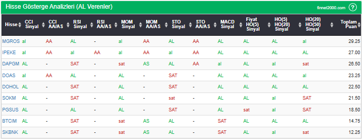 Bu çalışmada “AL” sinyali veren hisselerin tespiti amacıyla Borsa’da işlem gören BIST 100 hisseler değerlendirmeye alınmıştır. BIST 100 üzerinde teknik analizde kullanılan 12 gösterge yöntemi ile değerleme yapılarak puanlamaya gidilerek hisseler sıralanmıştır. Ancak hisse seçiminde teknik göstergelerin tek başına kullanılması yeterli değildir. Burada ön plana çıkan hisselerin temel analizle desteklemesi ve hisseyle ilgili son haber ve bilgilerin de değerlendirilerek işlemde bulunması, daha sağlıklı sonuçlar için yararlı olacaktır.