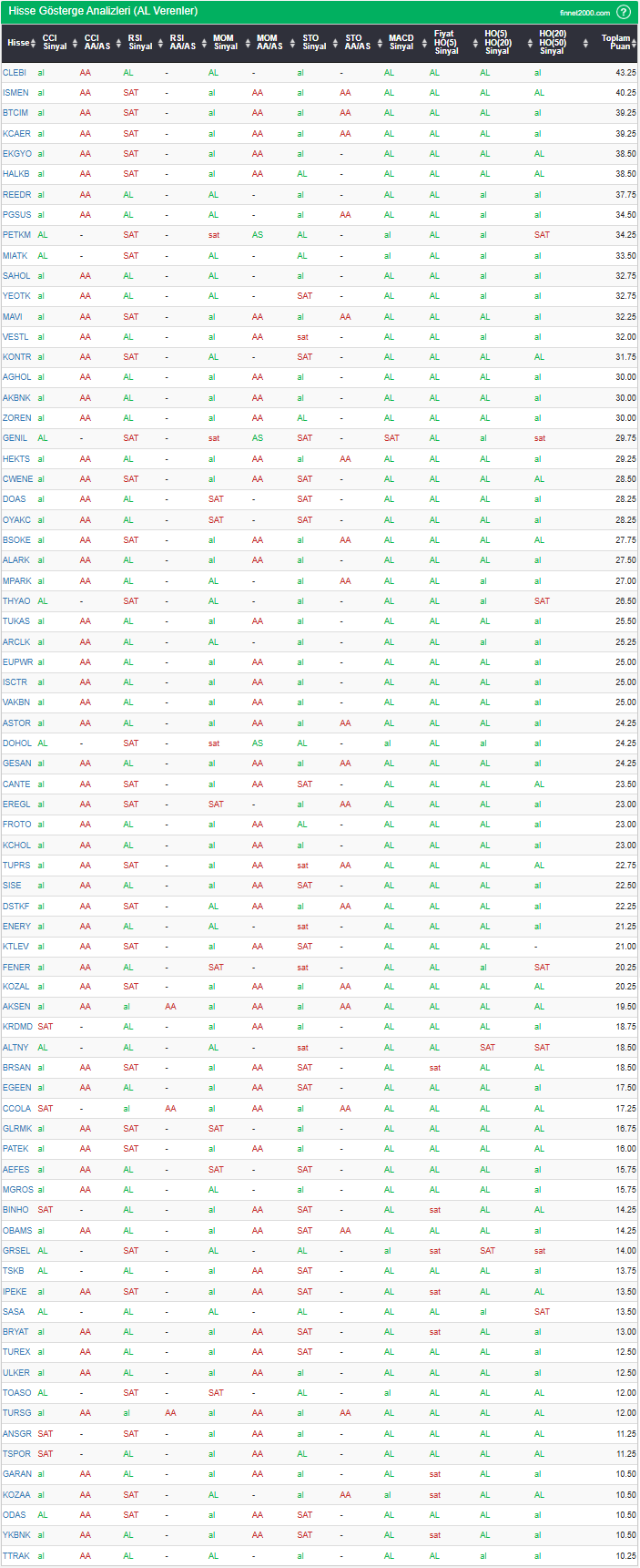 Bu çalışmada “AL” sinyali veren hisselerin tespiti amacıyla Borsa’da işlem gören BIST 100 hisseler değerlendirmeye alınmıştır. BIST 100 üzerinde teknik analizde kullanılan 12 gösterge yöntemi ile değerleme yapılarak puanlamaya gidilerek hisseler sıralanmıştır. Ancak hisse seçiminde teknik göstergelerin tek başına kullanılması yeterli değildir. Burada ön plana çıkan hisselerin temel analizle desteklemesi ve hisseyle ilgili son haber ve bilgilerin de değerlendirilerek işlemde bulunması, daha sağlıklı sonuçlar için yararlı olacaktır.