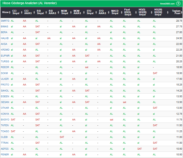 Bu çalışmada “AL” sinyali veren hisselerin tespiti amacıyla Borsa’da işlem gören BIST 100 hisseler değerlendirmeye alınmıştır. BIST 100 üzerinde teknik analizde kullanılan 12 gösterge yöntemi ile değerleme yapılarak puanlamaya gidilerek hisseler sıralanmıştır. Ancak hisse seçiminde teknik göstergelerin tek başına kullanılması yeterli değildir. Burada ön plana çıkan hisselerin temel analizle desteklemesi ve hisseyle ilgili son haber ve bilgilerin de değerlendirilerek işlemde bulunması, daha sağlıklı sonuçlar için yararlı olacaktır.