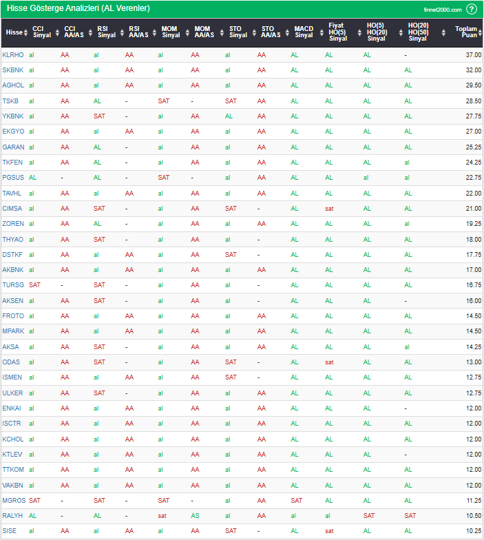 Bu çalışmada “AL” sinyali veren hisselerin tespiti amacıyla Borsa’da işlem gören BIST 100 hisseler değerlendirmeye alınmıştır. BIST 100 üzerinde teknik analizde kullanılan 12 gösterge yöntemi ile değerleme yapılarak puanlamaya gidilerek hisseler sıralanmıştır. Ancak hisse seçiminde teknik göstergelerin tek başına kullanılması yeterli değildir. Burada ön plana çıkan hisselerin temel analizle desteklemesi ve hisseyle ilgili son haber ve bilgilerin de değerlendirilerek işlemde bulunması, daha sağlıklı sonuçlar için yararlı olacaktır.