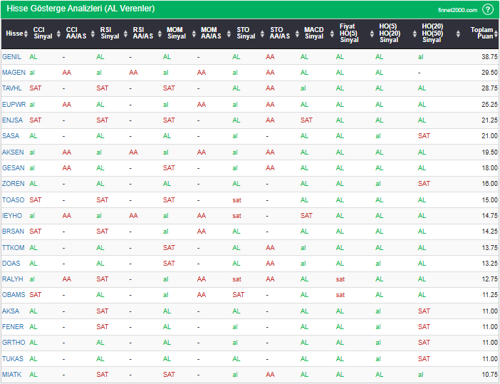 Bu çalışmada “AL” sinyali veren hisselerin tespiti amacıyla Borsa’da işlem gören BIST 100 hisseler değerlendirmeye alınmıştır. BIST 100 üzerinde teknik analizde kullanılan 12 gösterge yöntemi ile değerleme yapılarak puanlamaya gidilerek hisseler sıralanmıştır. Ancak hisse seçiminde teknik göstergelerin tek başına kullanılması yeterli değildir. Burada ön plana çıkan hisselerin temel analizle desteklemesi ve hisseyle ilgili son haber ve bilgilerin de değerlendirilerek işlemde bulunması, daha sağlıklı sonuçlar için yararlı olacaktır.