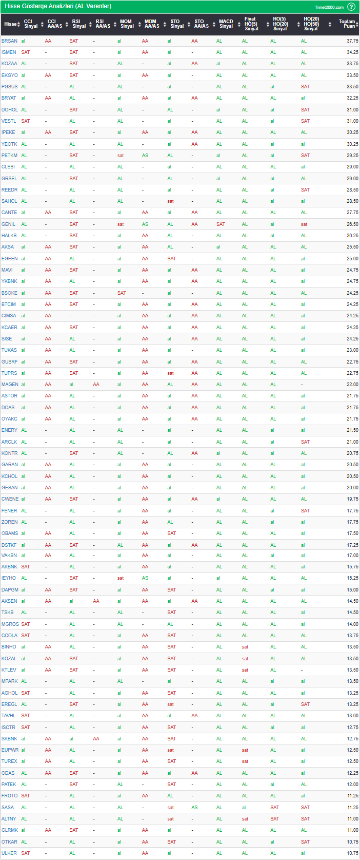 Bu çalışmada “AL” sinyali veren hisselerin tespiti amacıyla Borsa’da işlem gören BIST 100 hisseler değerlendirmeye alınmıştır. BIST 100 üzerinde teknik analizde kullanılan 12 gösterge yöntemi ile değerleme yapılarak puanlamaya gidilerek hisseler sıralanmıştır. Ancak hisse seçiminde teknik göstergelerin tek başına kullanılması yeterli değildir. Burada ön plana çıkan hisselerin temel analizle desteklemesi ve hisseyle ilgili son haber ve bilgilerin de değerlendirilerek işlemde bulunması, daha sağlıklı sonuçlar için yararlı olacaktır.