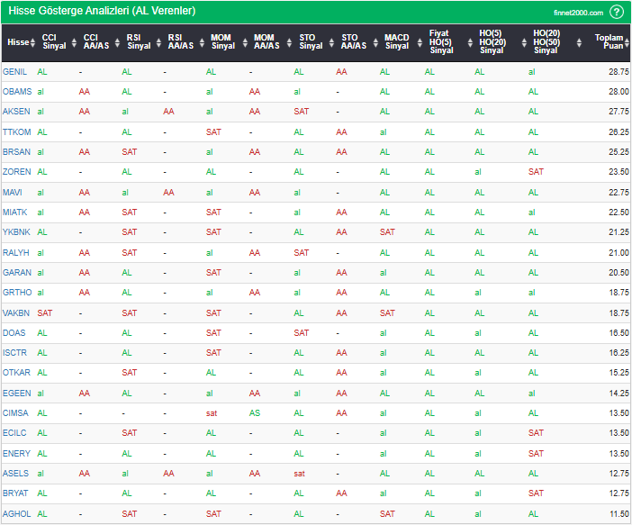 Bu çalışmada “AL” sinyali veren hisselerin tespiti amacıyla Borsa’da işlem gören BIST 100 hisseler değerlendirmeye alınmıştır. BIST 100 üzerinde teknik analizde kullanılan 12 gösterge yöntemi ile değerleme yapılarak puanlamaya gidilerek hisseler sıralanmıştır. Ancak hisse seçiminde teknik göstergelerin tek başına kullanılması yeterli değildir. Burada ön plana çıkan hisselerin temel analizle desteklemesi ve hisseyle ilgili son haber ve bilgilerin de değerlendirilerek işlemde bulunması, daha sağlıklı sonuçlar için yararlı olacaktır.