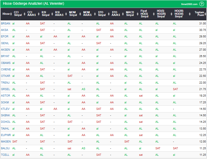 Bu çalışmada “AL” sinyali veren hisselerin tespiti amacıyla Borsa’da işlem gören BIST 100 hisseler değerlendirmeye alınmıştır. BIST 100 üzerinde teknik analizde kullanılan 12 gösterge yöntemi ile değerleme yapılarak puanlamaya gidilerek hisseler sıralanmıştır. Ancak hisse seçiminde teknik göstergelerin tek başına kullanılması yeterli değildir. Burada ön plana çıkan hisselerin temel analizle desteklemesi ve hisseyle ilgili son haber ve bilgilerin de değerlendirilerek işlemde bulunması, daha sağlıklı sonuçlar için yararlı olacaktır.