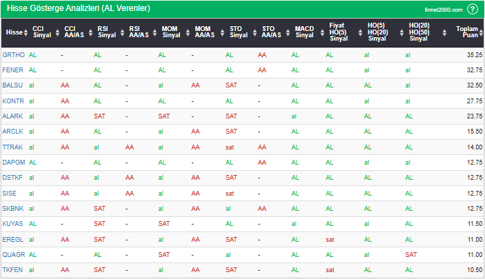 Bu çalışmada “AL” sinyali veren hisselerin tespiti amacıyla Borsa’da işlem gören BIST 100 hisseler değerlendirmeye alınmıştır. BIST 100 üzerinde teknik analizde kullanılan 12 gösterge yöntemi ile değerleme yapılarak puanlamaya gidilerek hisseler sıralanmıştır. Ancak hisse seçiminde teknik göstergelerin tek başına kullanılması yeterli değildir. Burada ön plana çıkan hisselerin temel analizle desteklemesi ve hisseyle ilgili son haber ve bilgilerin de değerlendirilerek işlemde bulunması, daha sağlıklı sonuçlar için yararlı olacaktır.