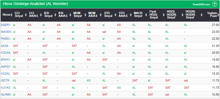 Bu çalışmada “AL” sinyali veren hisselerin tespiti amacıyla Borsa’da işlem gören BIST 100 hisseler değerlendirmeye alınmıştır. BIST 100 üzerinde teknik analizde kullanılan 12 gösterge yöntemi ile değerleme yapılarak puanlamaya gidilerek hisseler sıralanmıştır. Ancak hisse seçiminde teknik göstergelerin tek başına kullanılması yeterli değildir. Burada ön plana çıkan hisselerin temel analizle desteklemesi ve hisseyle ilgili son haber ve bilgilerin de değerlendirilerek işlemde bulunması, daha sağlıklı sonuçlar için yararlı olacaktır.