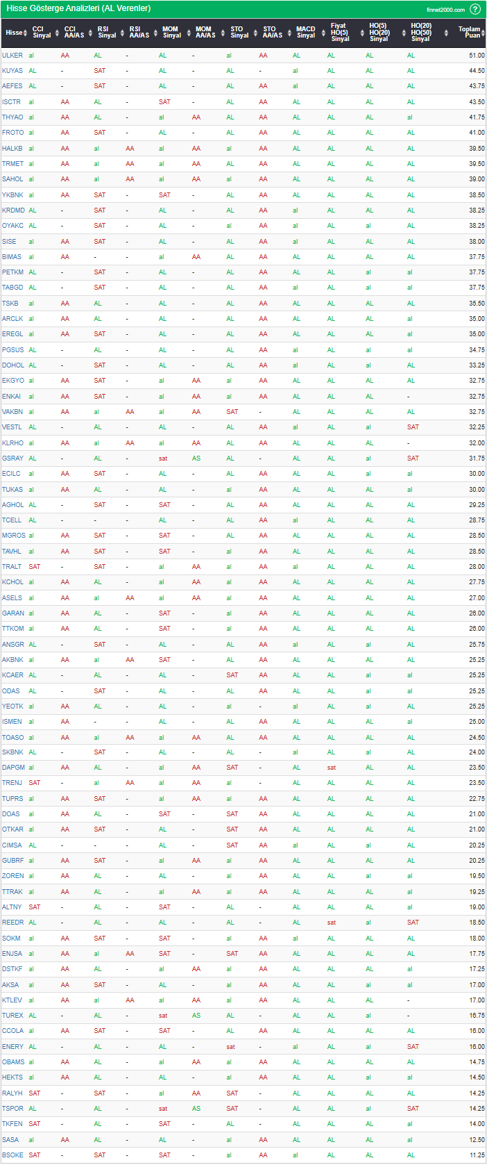 Bu çalışmada “AL” sinyali veren hisselerin tespiti amacıyla Borsa’da işlem gören BIST 100 hisseler değerlendirmeye alınmıştır. BIST 100 üzerinde teknik analizde kullanılan 12 gösterge yöntemi ile değerleme yapılarak puanlamaya gidilerek hisseler sıralanmıştır. Ancak hisse seçiminde teknik göstergelerin tek başına kullanılması yeterli değildir. Burada ön plana çıkan hisselerin temel analizle desteklemesi ve hisseyle ilgili son haber ve bilgilerin de değerlendirilerek işlemde bulunması, daha sağlıklı sonuçlar için yararlı olacaktır.