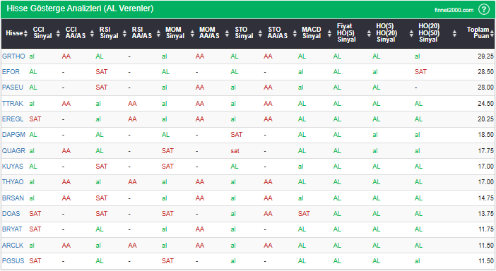 Bu çalışmada “AL” sinyali veren hisselerin tespiti amacıyla Borsa’da işlem gören BIST 100 hisseler değerlendirmeye alınmıştır. BIST 100 üzerinde teknik analizde kullanılan 12 gösterge yöntemi ile değerleme yapılarak puanlamaya gidilerek hisseler sıralanmıştır. Ancak hisse seçiminde teknik göstergelerin tek başına kullanılması yeterli değildir. Burada ön plana çıkan hisselerin temel analizle desteklemesi ve hisseyle ilgili son haber ve bilgilerin de değerlendirilerek işlemde bulunması, daha sağlıklı sonuçlar için yararlı olacaktır.