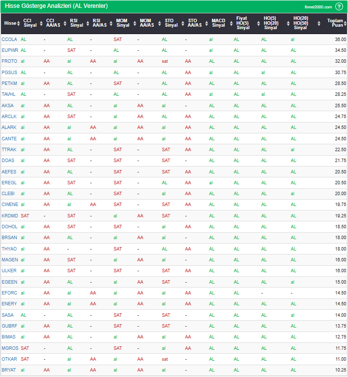Bu çalışmada “AL” sinyali veren hisselerin tespiti amacıyla Borsa’da işlem gören BIST 100 hisseler değerlendirmeye alınmıştır. BIST 100 üzerinde teknik analizde kullanılan 12 gösterge yöntemi ile değerleme yapılarak puanlamaya gidilerek hisseler sıralanmıştır. Ancak hisse seçiminde teknik göstergelerin tek başına kullanılması yeterli değildir. Burada ön plana çıkan hisselerin temel analizle desteklemesi ve hisseyle ilgili son haber ve bilgilerin de değerlendirilerek işlemde bulunması, daha sağlıklı sonuçlar için yararlı olacaktır.