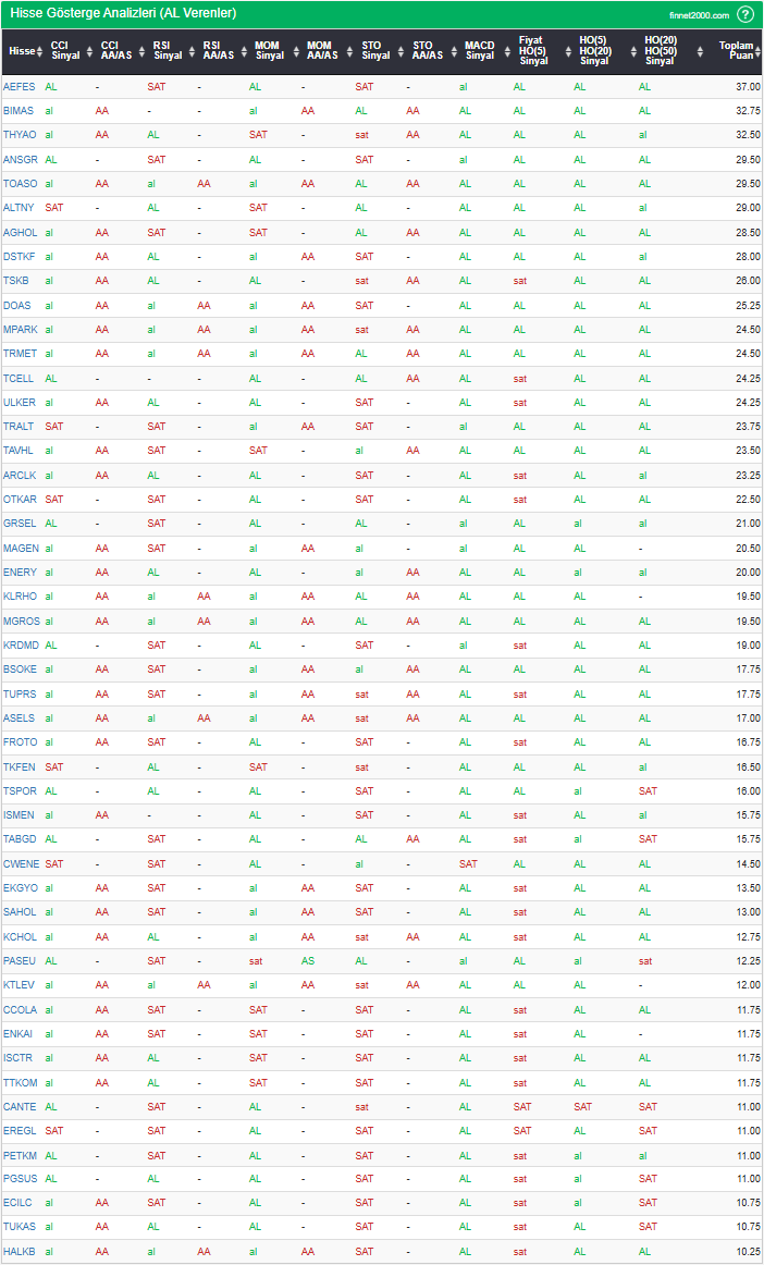 Bu çalışmada “AL” sinyali veren hisselerin tespiti amacıyla Borsa’da işlem gören BIST 100 hisseler değerlendirmeye alınmıştır. BIST 100 üzerinde teknik analizde kullanılan 12 gösterge yöntemi ile değerleme yapılarak puanlamaya gidilerek hisseler sıralanmıştır. Ancak hisse seçiminde teknik göstergelerin tek başına kullanılması yeterli değildir. Burada ön plana çıkan hisselerin temel analizle desteklemesi ve hisseyle ilgili son haber ve bilgilerin de değerlendirilerek işlemde bulunması, daha sağlıklı sonuçlar için yararlı olacaktır.