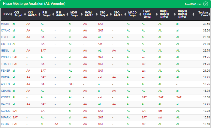 Bu çalışmada “AL” sinyali veren hisselerin tespiti amacıyla Borsa’da işlem gören BIST 100 hisseler değerlendirmeye alınmıştır. BIST 100 üzerinde teknik analizde kullanılan 12 gösterge yöntemi ile değerleme yapılarak puanlamaya gidilerek hisseler sıralanmıştır. Ancak hisse seçiminde teknik göstergelerin tek başına kullanılması yeterli değildir. Burada ön plana çıkan hisselerin temel analizle desteklemesi ve hisseyle ilgili son haber ve bilgilerin de değerlendirilerek işlemde bulunması, daha sağlıklı sonuçlar için yararlı olacaktır.