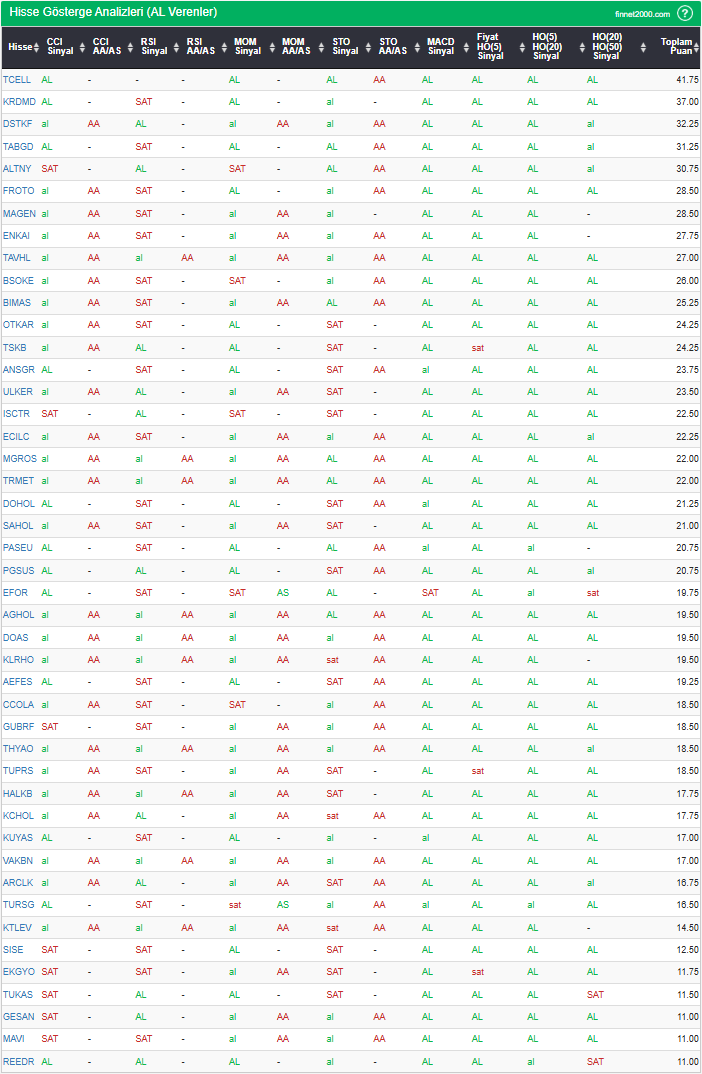 Bu çalışmada “AL” sinyali veren hisselerin tespiti amacıyla Borsa’da işlem gören BIST 100 hisseler değerlendirmeye alınmıştır. BIST 100 üzerinde teknik analizde kullanılan 12 gösterge yöntemi ile değerleme yapılarak puanlamaya gidilerek hisseler sıralanmıştır. Ancak hisse seçiminde teknik göstergelerin tek başına kullanılması yeterli değildir. Burada ön plana çıkan hisselerin temel analizle desteklemesi ve hisseyle ilgili son haber ve bilgilerin de değerlendirilerek işlemde bulunması, daha sağlıklı sonuçlar için yararlı olacaktır.