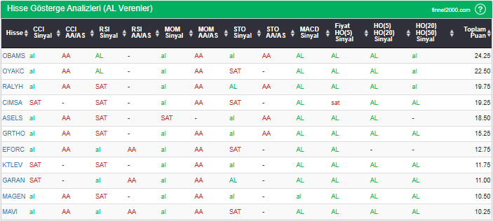 Bu çalışmada “AL” sinyali veren hisselerin tespiti amacıyla Borsa’da işlem gören BIST 100 hisseler değerlendirmeye alınmıştır. BIST 100 üzerinde teknik analizde kullanılan 12 gösterge yöntemi ile değerleme yapılarak puanlamaya gidilerek hisseler sıralanmıştır. Ancak hisse seçiminde teknik göstergelerin tek başına kullanılması yeterli değildir. Burada ön plana çıkan hisselerin temel analizle desteklemesi ve hisseyle ilgili son haber ve bilgilerin de değerlendirilerek işlemde bulunması, daha sağlıklı sonuçlar için yararlı olacaktır.
