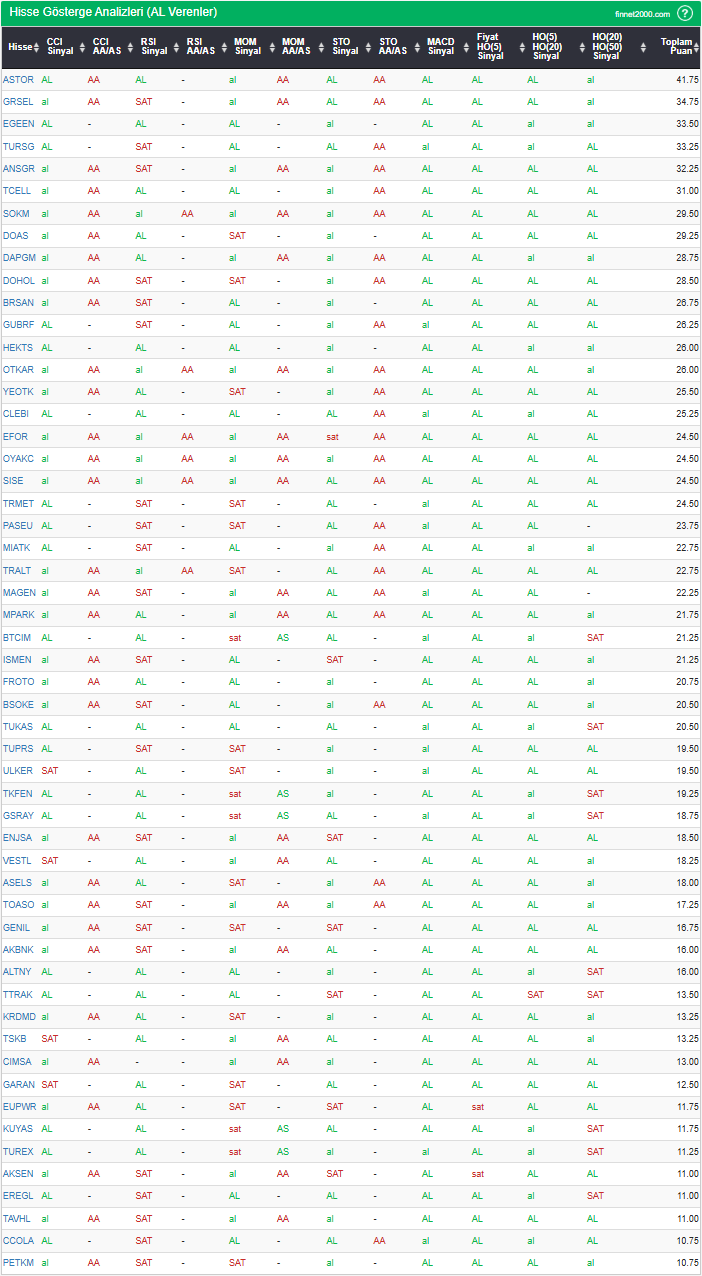 Bu çalışmada “AL” sinyali veren hisselerin tespiti amacıyla Borsa’da işlem gören BIST 100 hisseler değerlendirmeye alınmıştır. BIST 100 üzerinde teknik analizde kullanılan 12 gösterge yöntemi ile değerleme yapılarak puanlamaya gidilerek hisseler sıralanmıştır. Ancak hisse seçiminde teknik göstergelerin tek başına kullanılması yeterli değildir. Burada ön plana çıkan hisselerin temel analizle desteklemesi ve hisseyle ilgili son haber ve bilgilerin de değerlendirilerek işlemde bulunması, daha sağlıklı sonuçlar için yararlı olacaktır.