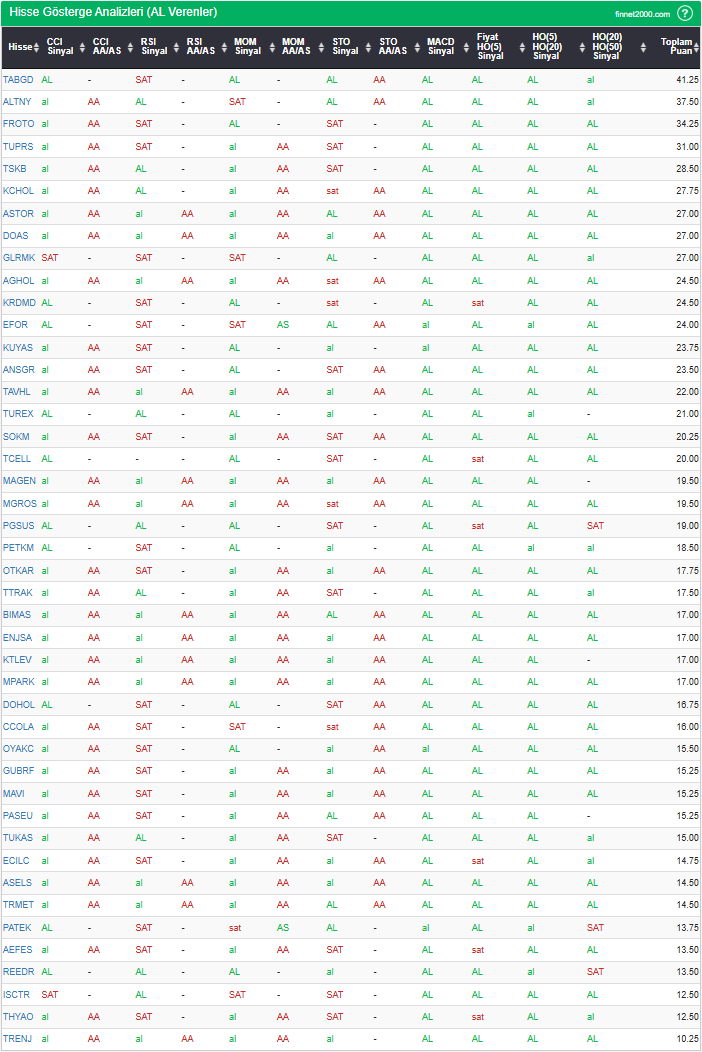 Bu çalışmada “AL” sinyali veren hisselerin tespiti amacıyla Borsa’da işlem gören BIST 100 hisseler değerlendirmeye alınmıştır. BIST 100 üzerinde teknik analizde kullanılan 12 gösterge yöntemi ile değerleme yapılarak puanlamaya gidilerek hisseler sıralanmıştır. Ancak hisse seçiminde teknik göstergelerin tek başına kullanılması yeterli değildir. Burada ön plana çıkan hisselerin temel analizle desteklemesi ve hisseyle ilgili son haber ve bilgilerin de değerlendirilerek işlemde bulunması, daha sağlıklı sonuçlar için yararlı olacaktır.