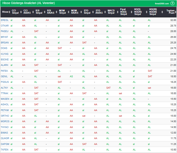 Bu çalışmada “AL” sinyali veren hisselerin tespiti amacıyla Borsa’da işlem gören BIST 100 hisseler değerlendirmeye alınmıştır. BIST 100 üzerinde teknik analizde kullanılan 12 gösterge yöntemi ile değerleme yapılarak puanlamaya gidilerek hisseler sıralanmıştır. Ancak hisse seçiminde teknik göstergelerin tek başına kullanılması yeterli değildir. Burada ön plana çıkan hisselerin temel analizle desteklemesi ve hisseyle ilgili son haber ve bilgilerin de değerlendirilerek işlemde bulunması, daha sağlıklı sonuçlar için yararlı olacaktır.