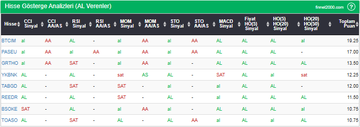 Bu çalışmada “AL” sinyali veren hisselerin tespiti amacıyla Borsa’da işlem gören BIST 100 hisseler değerlendirmeye alınmıştır. BIST 100 üzerinde teknik analizde kullanılan 12 gösterge yöntemi ile değerleme yapılarak puanlamaya gidilerek hisseler sıralanmıştır. Ancak hisse seçiminde teknik göstergelerin tek başına kullanılması yeterli değildir. Burada ön plana çıkan hisselerin temel analizle desteklemesi ve hisseyle ilgili son haber ve bilgilerin de değerlendirilerek işlemde bulunması, daha sağlıklı sonuçlar için yararlı olacaktır.
