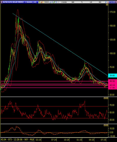 • Düşen trendin altında hareketine devam eden hisse 22 günlük ortalamasının üzerinde ve 50 günlük ortalamasına yakın seyrediyor.