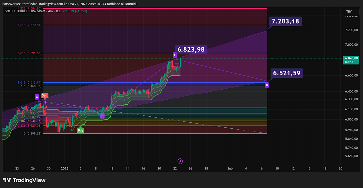 Altın/TL paritesi 4 saatlik grafikte güçlü bir yükseliş trendi içerisinde seyrediyor. Fiyat hareketleri yükselen bir kanal formasyonu içinde ilerlerken, 6.826 TL seviyesinde işlem görüyor. Teknik göstergeler yukarı yönlü momentumun devam ettiğini saptıyoruz.