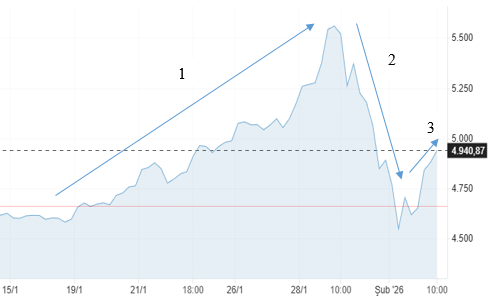 Altın fiyatının (USD/Ons) son 20 gündeki gelişimini gösteren grafik (03.02.2026 saat 12.30) aslında her şeyin özeti gibi. Önce Trump’ın yarattığı risklere İran meselesi de eklenince panik halinde altına hücum yaşanıyor (1 ile gösterilen bölge) ve yaklaşık iki haftada altın ons fiyatı 4.500 dolardan 5.500 dolara fırlıyor. Sonra burada bir anormallik olduğunun farkında olanlar sanki yaratılan bütün risklerin şahin yaklaşımlı bilinen Kevin Warsh’ın Fed Başkanlığı için aday gösterilmesiyle çözüldüğü bahanesiyle kâr realizasyonuna gidiyorlar. Bu kez panik satışlar başlıyor ve altın fiyatı hızla düşüşe geçiyor. Bugün gelinen aşamada panik davranışlar durulmuş gibi görünüyor. Hiç kuşkusuz bu dönemde altın fiyatını yükselten ve yüksekken satıp şimdi tekrar düşükken alan büyük yatırımcılar büyük paralar kazanıyor. Benzer durum gümüşte ve diğer değerli metallerde de söz konusu.