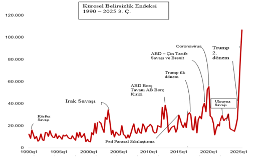 Aşağıda dünya belirsizlik endeksinde 1990’dan bu yana yaşanan değişimler yer alıyor: (kaynak: https://cepr.org/voxeu/columns/global-economy-hit-higher-uncertainty)