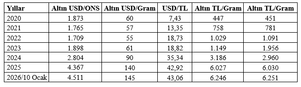 (Kaynak: USD/Ons altın fiyatları için; www.tradingeconomics.com, USD/TL kurları için TCMB; https://www.tcmb.gov.tr/kurlar/kurlar_tr.html, Altın TL/Gram için; https://www.anlikaltinfiyati.com/5-yil-once-gram-altin-fiyati-ne-kadardi.html)