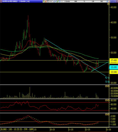 27,40 seviyesi hem yatay direnç hem de ortalama direnci olduğu için kritik; bu seviye hacimli kırılmadan kalıcı yükselişten söz etmek zor. Aşağıda 25,10’un altına sarkma olursa 23,50 seviyesi yeniden gündeme gelir ve bu bölge ana stop alanı olur.